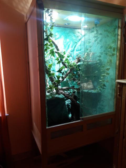 Er wohnt in einem grossen Terrarium welches Extra von einem Shreiner angefertigt wurde und von uns eingerichtet